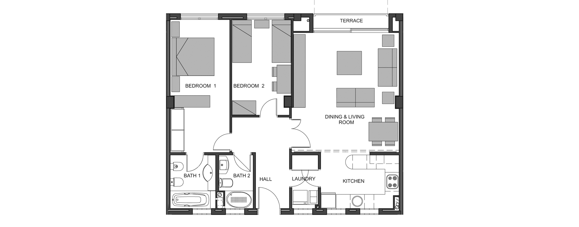 La superficie de la vivienda es de 80 m2 más terraza, con un amplio salón-comedor, cocina y lavadero independientes, habitaciones con armarios empotrados, un baño completo con jacuzzi y un baño completo con ducha.